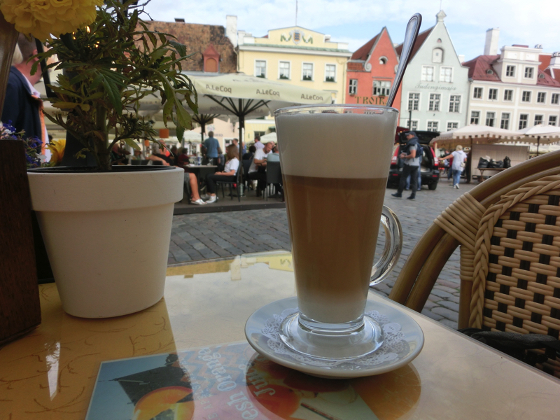 ラエコヤ広場の入り口にあるのが聖霊教会。ここは14世紀に建立された、タリン最古の教会。さて、広場に戻ってきたぞ。まだまだにぎやかで、ここでちょっとカフェタイム。広場に面した席で、カフェオレを楽しみましょうか(10.5)。しばらくすると広場の屋台が営業終了で片付けられ、市庁舎がよく見えるようになりました。こうなると意外に広く感じる。ここでクリスマスマーケットも行われるのかな。