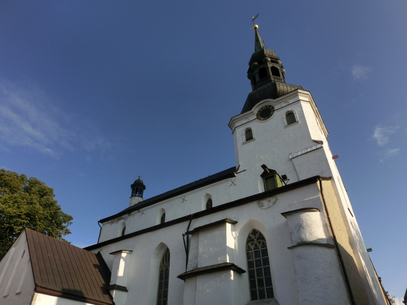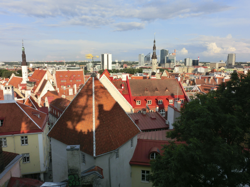 それにしても、いい天気になってきた。もはや快晴といってもいいくらい。今の時間帯なら、展望台からの景色がきれいだと思われるので歩きましょう。まだお腹もいっぱいだしね。カフェを出て、迷路のような通りを歩いていく。聖ニコラス教会を過ぎ、このあたりからは狭い上り坂。その登りきったところにあるのがアレクサンドル・ネフスキー聖堂。ロシア風の屋根がかわいらしい。さらに進み、大聖堂のわき道を抜けるとそこはコフトウッツァ展望台。ここからは、赤い切り妻屋根の建物や教会の尖塔、そしてバルト海までもが一望できる。ちょうど傾きかけた太陽の光が屋根にあたっており、とてもきれいな景色だ。今日は雨予報だったはずなのに、いい感じに天気予報は外れてくれるものです。