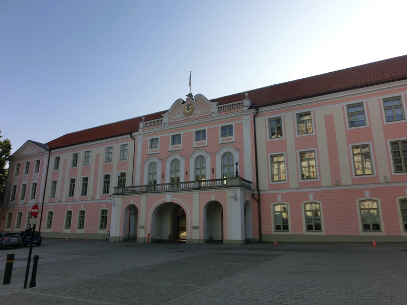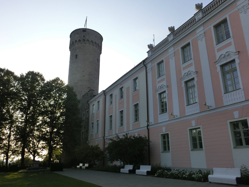 ここまで来たならもう少し散策しよう。大聖堂まで戻り、ぐるっと回ってみる。するともう一つの展望台があり、ここからはバルト海が見えるが逆光なのでちょっとまぶしいかな。さらに進むと、再びアレクサンドル・ネフスキー大聖堂。今度は正面からだし、太陽の光もあたってとても美しい。その前にあるのがトームペア城。13世紀に建てられたとのことだが、このピンク色の建物は18世紀後半にエカテリーナ2世の命により建てられた旧知事官邸。