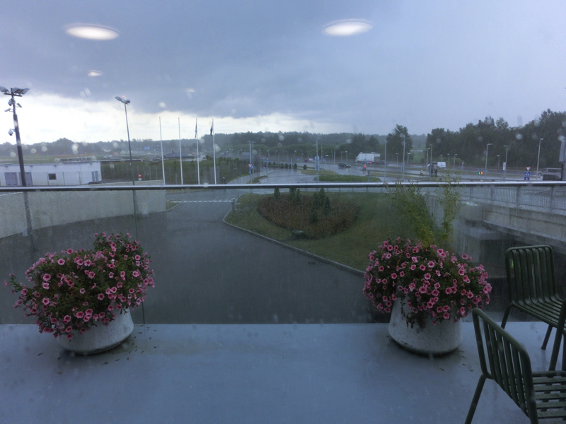 しばらく走ると、急に大雨となった。雷も鳴っているし、なかなかの豪雨。バスの移動中に、しっかり降ってくれればいいね。大雨エリア抜け、晴れ間が戻ってきたかな。そしてバスは定刻を少し過ぎたころ、13時半過ぎにタリンのバスターミナルに到着。