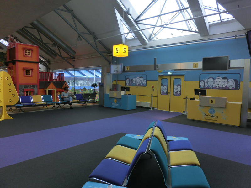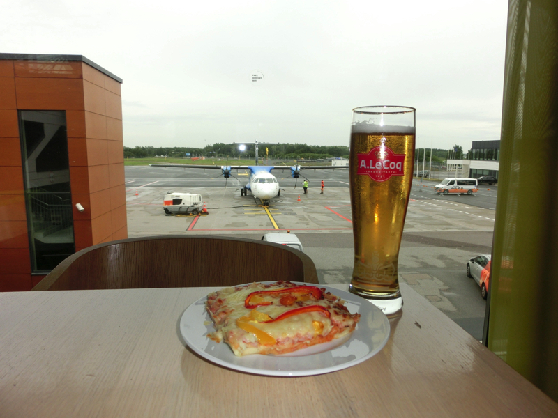 16時半を過ぎ、そろそろチェックインの時間。カウンターの周りに人が集まり始めたので並びましょう。手続きが始まると、あっという間に長い列ができました。席は予約済みなので手続きもスムーズ、出発ロビーへ行きましょう。セキュリティチェックに免税店を過ぎると、そこは出発ゲート。ここタリン空港はそのデザインの奇抜さが知られているようだが、確かにいきなりレクサスがあったりするし、ゲート前の待合場所がそのままパブになったりしている。ゲートそのものも、単なるドアではなく電車のデザインになっていたり、なんと卓球台があったりもする。なかなか面白い空港だね。まだ時間はあるのでビールでもいただきますか。本当はシーフードの炒め物を一緒に頂きたかったがちょっと順番待ちで時間がかかるとのことで、ピザとともにいただきましょう。飛行機を見ながらのひと時、いいですね(11.8)。