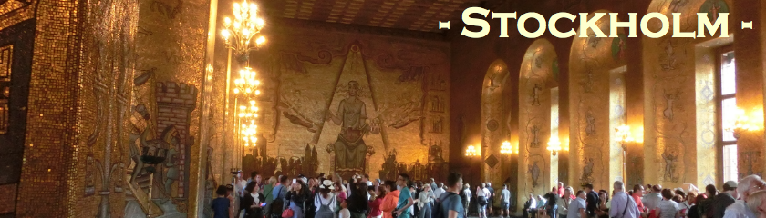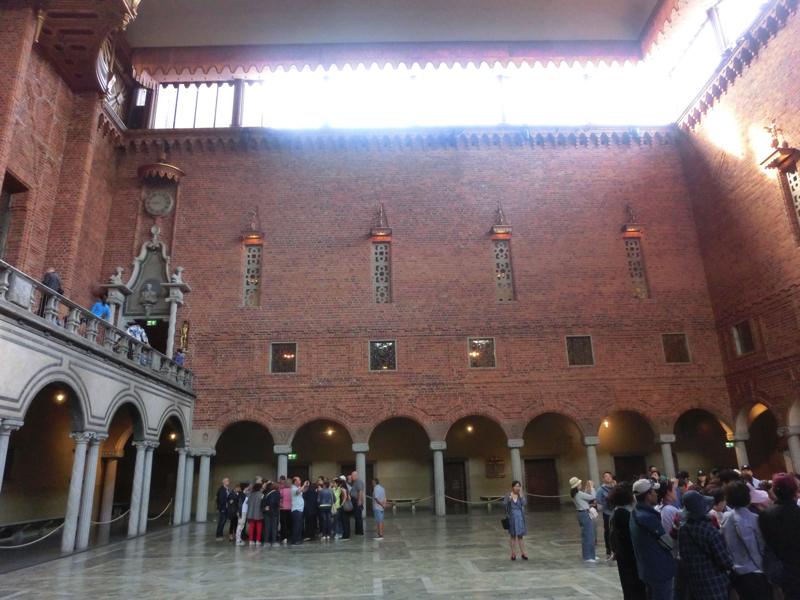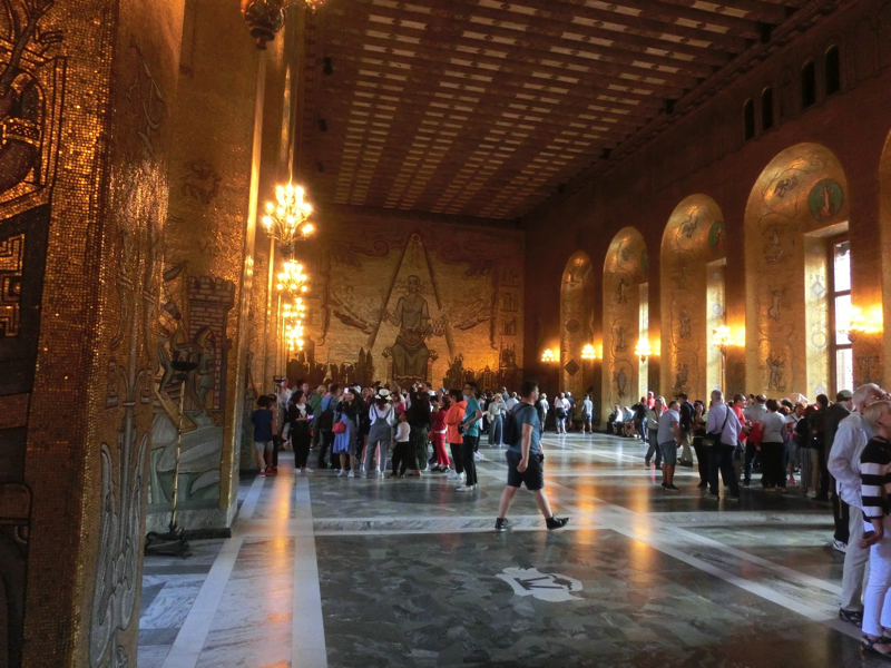その先には王子のギャラリー。壁にあるたくさんの絵は、窓からも見えているメーラレン湖をエウシェン王子が描いたもの。そしてその奥にある部屋が、黄金の間。ここはノーベル賞の授賞式の際に、ダンスパーティが行われる場所。いまここにはいろんな国からの観光客がいるが、毎年秋には世界が注目する華やかな場所になるということですね。この部屋の前からはさっきいたブルーホールが見下ろせる。年に一度、世界が注目する場所を見学できて楽しかったです。