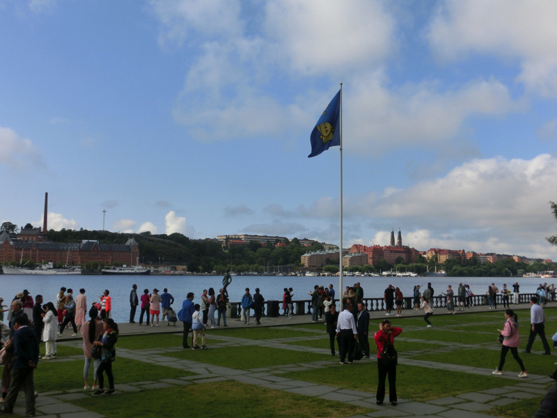 市庁舎の建物を出ると、メーラレン湖沿いの庭に出てくる。対岸にはストックホルムの繁華街、ガラムスタンにあるリッダーホルム教会からずっと建物が続いているのが見える。美しい建物が並ぶ様子はなんとも絶景、ただそれが長すぎて写真では伝わりにくい・・北欧らしい、爽やかな景色でした。