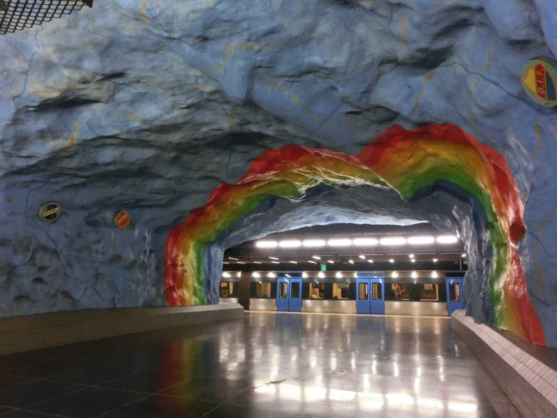 市庁舎を出て、ストックホルム中央駅へ。ここからメトロに乗り、10分ほどでStadion駅に到着(@45)。駅の構内はまるでトンネルを掘った後の岩肌がそのまま残っているようで、それが青をベースとしてカラフルに色付けられていてとても不思議な空間になっている。ストックホルムの地下鉄はこうした造りのところも多いようで、そうした駅をめぐるツアーなんてのもあるようです。われわれの目的は、ここで1912年に行われたオリンピックスタジアムに行くこと。そう、大河ドラマ「いだてん」の序盤の舞台になった場所だ。100年以上前に行われたオリンピックのメインスタジアムがまだ残っていることもすごいし、いまだに使用されているとのこと。