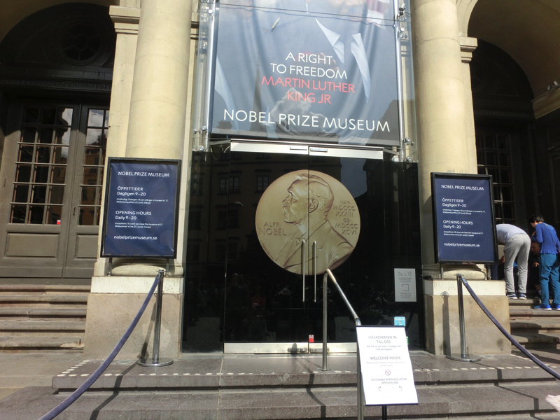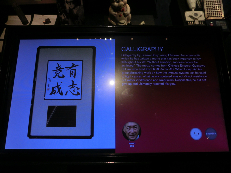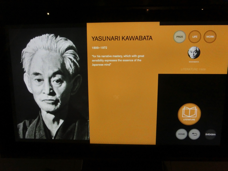 スタジアムを後にし、再びメトロへ。ストックホルム中央駅の次、ガラムスタン駅にて降りる(@45)。このあたりはいわゆる繁華街でお店がたくさんあり、多くの人がいる。そして大広場に面して建っているのが、ノーベル博物館。中に入ると、まず昨年受賞者に関する展示があった(@120)。ここ数年日本人の受賞者が続いているし、昨年受賞の本庶佑先生が紹介されているのを見るとやはり日本人として誇らしい。館内の天井には、歴代の受賞者の写真などが記載された垂れ幕がゆっくりと動いている。順番がランダムに並んでいるのでいつ日本人が出てくるかと見ていたら、川端康成と田中耕一両先生を見つけることができました。
