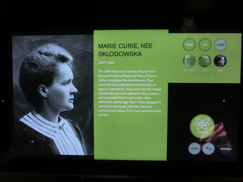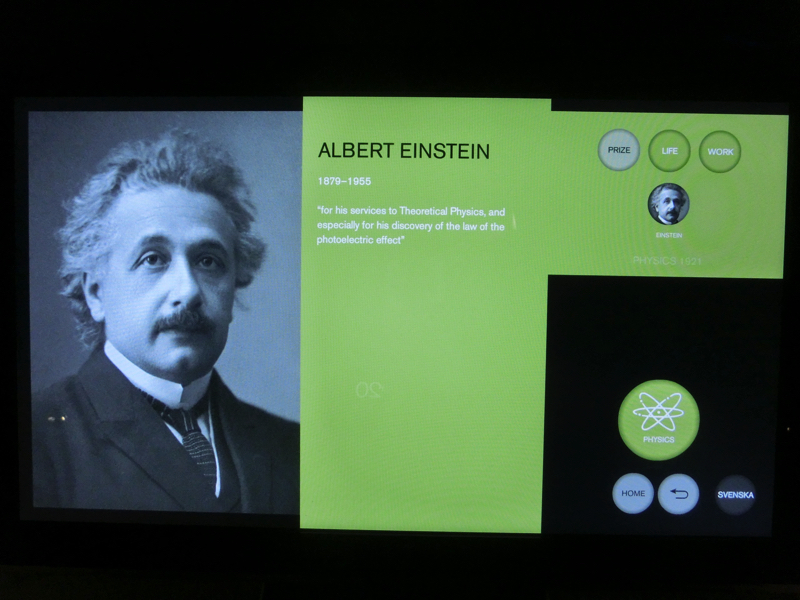 ここ最近の受賞者や、日本人最初の湯川秀樹、文学賞の川端康成、平和賞の佐藤栄作など各先生の錚々たる経歴を見ることができた。もっと過去も見てみよう。最初の受賞者は1901年のレントゲンなどで、1903年物理学賞にはキュリー夫妻。夫人の方は1911年にも受賞しており、このときは化学賞。そんなことも分かって面白い。1921年のアインシュタイン、舌を出した写真が有名だがここにある写真はさすがにきっちりしている。そうか、こういう写真もあるんだね。