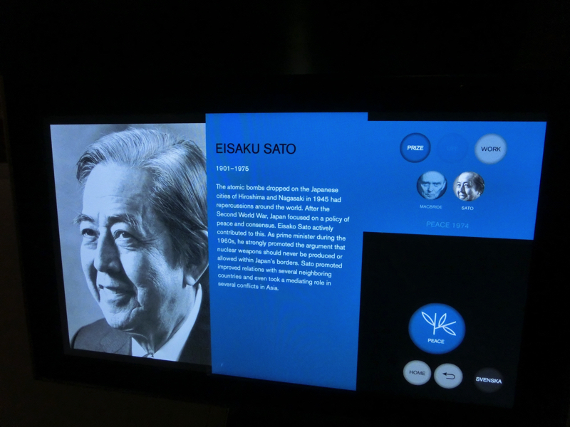 あとは企画展として、今はキング牧師関連の展示がされている。ざっと1年ほど展示されるようです。館内中央には歴代の受賞者のプロフィールや受賞内容などが年代別に自由に調べられるモニタがある。まずはやっぱり日本人を調べたいので、小学校の大先輩である山中伸弥先生から見てみよう。