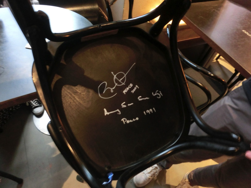 館内にはカフェもあるのでちょっと休憩。ここはノーベルアイスクリームをいただきましょう。ノーベル賞のメダル型のチョコレートが添えられていておいしいです。コーヒーとともに、ゆったりといただきましょう(185)。このカフェにある椅子の裏には、ここ最近のノーベル賞受賞者のサインがあるとのこと。座っている椅子の裏を見ると、そこには本庶佑先生のサインが。すばらしい。近くの席の椅子を裏返してみると、そこには2008年化学賞の益川敏英先生と小林誠先生、そして別の椅子には2015年物理学賞の梶田隆章先生のサインが。どこかに山中伸弥先輩のサインがあるはずだが、残念ながら見つけられず。その代わりといってはなんだけど、近くの席の人がちょうどオバマ大統領のサインを撮っていたので、せっかくなので撮らせていただきました。見所の多いノーベル博物館、堪能しました。では行きますか。