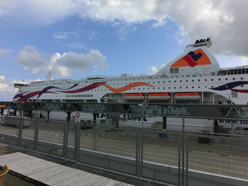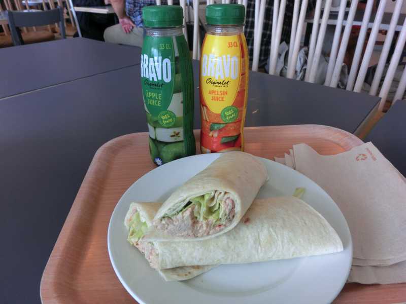 港へのバス乗り場に行くと、ちょうど数分前にでたばかり。次のバスが1時間ちかく後なので、さすがにそこまでは待てない。タクシーで行きますか。港まで350クローネと言われたが、クローネの現金が310しかないというとそれでいいと。ありがとうございます。タクシーは中央駅の脇を抜け、港へと向かう。街中を縫うように走り、しばらくすると港エリアへ。大きな船を見ながら走り、ターミナルビルに到着。船の出発まではまだ時間があるが、まずはチェックインしましょう。船の乗船券やディナー券などに交換し、これで一安心。今日は昼ごはんがまだなので、ちょっと食べておきますか。構内にあるカフェへと行き、トルティーヤのような生地で巻いたツナのラップとジュースをいただきましょう(139)。ちょっと酸味のあるリンゴジュース、結構好みです。