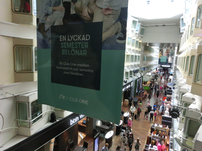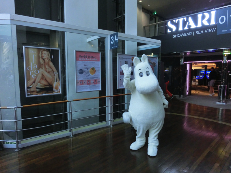 では船へと乗り込みましょう。ここからはタリン行きやリガ行きの船も出ており、大きな船が並ぶ姿は壮観だ。ヘルシンキ行きに向かうと、船の側面にムーミンとサンタクロースの絵が見え、いかにもフィンランドのイメージがいい感じ。船の入り口ではムーミンがお出迎えしてくれ、船内へ。中は巨大な吹き抜けになっており、たくさんのお店があるようだ。あとからゆっくり見るとして、まずは部屋へ。
