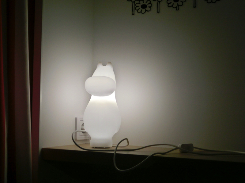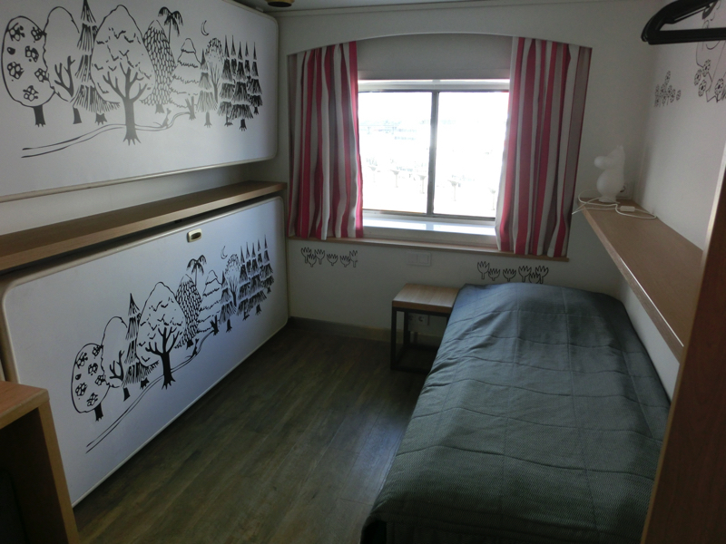 9階にある部屋へと行くと、そこはムーミン部屋。壁にはムーミンのキャラクターがいろいろ描かれている。片方が二段ベットで畳まれているが、それを開くとまた出てきた。パパママはもちろん、スナフキンもミイもニョロニョロもいるぞ。ムーミン型のランプもあるし、窓から外もみえるし、楽しい部屋ですね。さあ、出発までデッキに行きましょう。