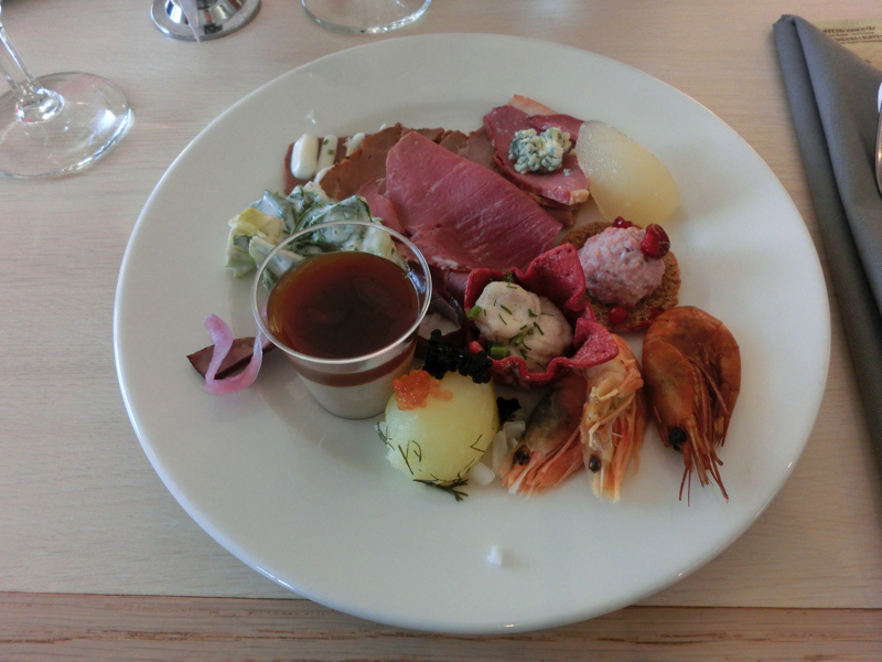 19時を過ぎた。夜ごはんは19時半からだが、多くの人で集中するだろうし多少は早く行っても問題ないでしょう。6FのGrandBuffeに行くと、すでにたくさんの人がいました。広いレストランには、たくさんのビュッフェが並んでいる。少しずつ、とにかくたくさんの種類を食べてみよう。ビールもワインも飲み放題なのでこれは危険だな。まずは冷たい系をいただくが、一度では取り切れない。ニシンだけでも何種類もあるし、肉系もラムやトナカイのハムなど変わったものもあるし。どれもおいしいです。温かい系のメインとなるのはやっぱりローストビーフかな。肉厚でおいしいです。窓からみえる景色は、穏やかな海と水平線に沈む夕日。いいですね。さて、締めにはデザート、これも何種類もあるが結構なくなっているものも多く、さっぱり系をいただきましょう。ごちそうさまでした。