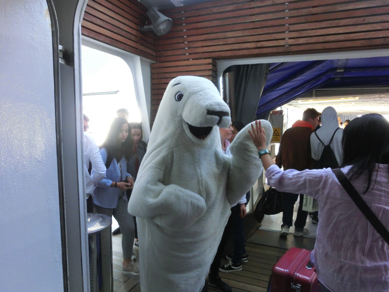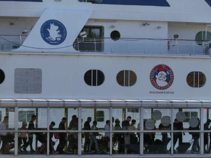 部屋を出る準備ができたところで、デッキに出てみよう。もうすでにヘルシンキの街が見えており、教会や聖堂などがわかる。晴天の中、ストックホルムから滑るように進んできたシリアライン・セレナーデ号はほぼ10時の定刻通りにヘルシンキに到着。降りるときはみんな集中するので、7階のプロムナードは大混雑だ。順番に船を出ていくと、シリアラインのキャラクターが見送ってくれました。これはシリアくん、かな。さあ、今日からヘルシンキを楽しみましょう。