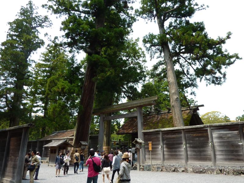 第二の鳥居を過ぎると、神楽殿に到着。ここでは祈祷などが受けられる。お守りやご朱印もいただけるので、また後ほど。そしていよいよ、御正宮に到着。ここでは毎日朝夕に天照大御神にお食事(神饌)が捧げられているらしい。ここは四重の板垣で囲われていて、写真はその外側からしか撮れないのが残念。中に入るのも一般人は最初の壁の中までで、これより奥には皇室の方でないと入れないらしい。だからこその厳かな場所なんだけど、今日は人が多いなあ。この敷地のすぐ隣には新しい敷地があり、ここに遷宮するわけですね。新しくなったら是非また。