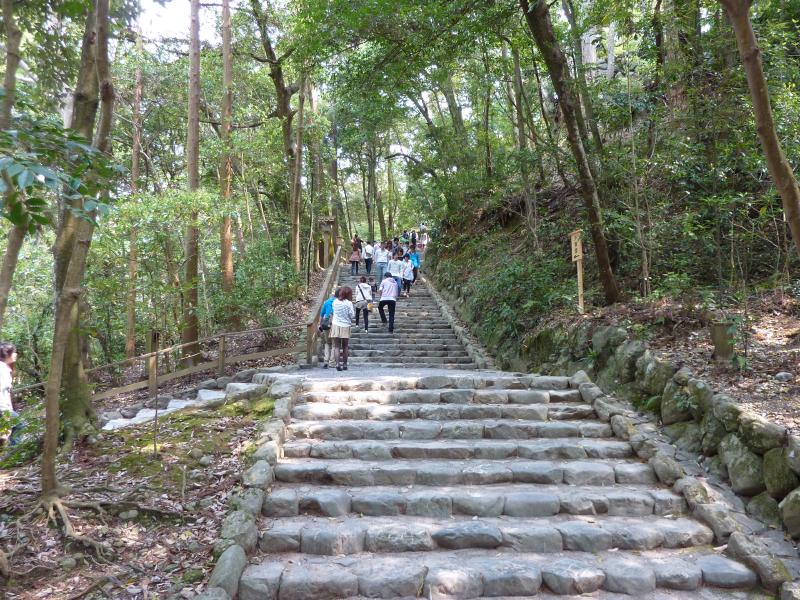 このあとは別宮を巡る。まずは風宮。ここは雨風の神様を祀っていて、農業を守る神様。元寇の時には神風を吹かせたともいわれている。次は土宮。外宮一帯の土地を守る地主の神様とのことで、外宮の中では最古老とのこと。少し目立たないところにひっそりとあるのが下御井神社。ここは飲料水の守護神らしい。石の階段を上った所にあるのが多賀宮。ここが最も格式の高い別宮で、御正殿に祀られている豊受大神の和御魂(にぎみたま)と対をなす荒御魂(あらみたま)が祀られている。神様の中にある静と動がそれぞれ祀られているということ。