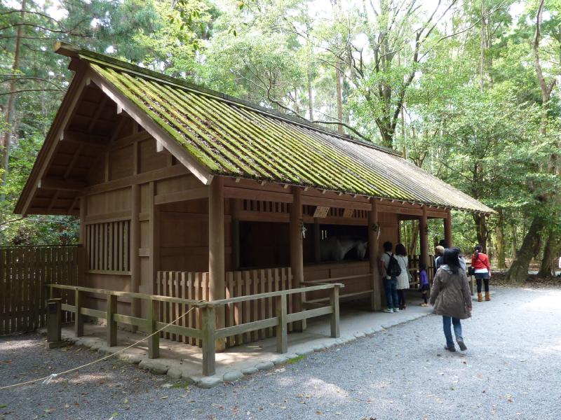 これで一通り回ったかな。神楽殿に戻ってきたので、お守りやご朱印をいただきましょう。さて、そろそろ行きますか。ここから裏参道に向けての道は、ちょうど今はさほど人はいない。静かな道で深呼吸しながらゆっくり歩く。しばらく行くと北御門鳥居に到着。ここを過ぎると御厩があり、そこには神馬がいた。葦毛のきれいな馬だ。最後に火除橋を過ぎて、これにて外宮の参拝完了。