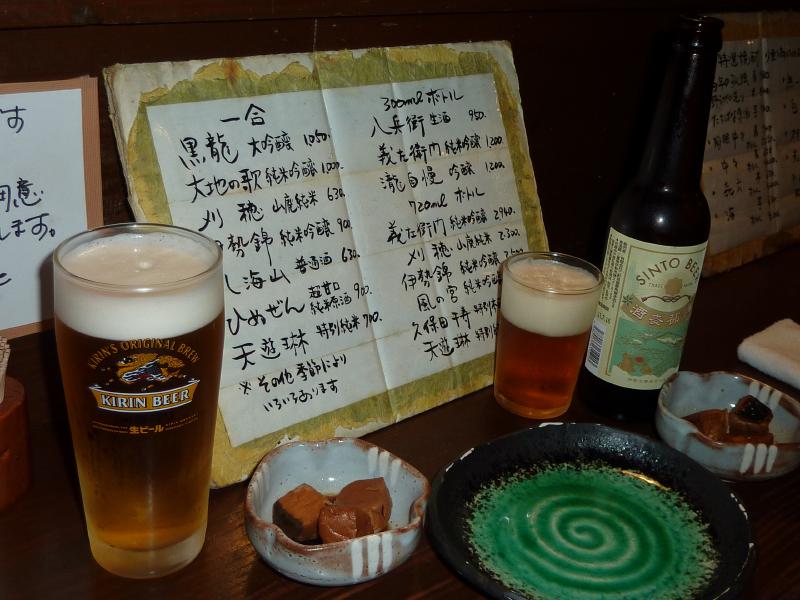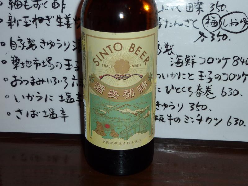 今日はその中にある、「虎丸」という居酒屋さんに行く。今日は予約でいっぱいで、17時から2時間しか取れていないのでオープンと同時に入る。蔵の中らしく、天井が高く少し暗い店内に、しっかりとした造りのカウンターがいい雰囲気だ。この店は完全全席禁煙なのでありがたい。どの席にいても安心していられるね。さて、まずはビールで喉を潤そう。伊勢の地ビール「神都麦酒」、イーストの効いたフルーティーなビールだ。突き出しのマグロの煮付け、これがビールとよくあう。突き出しのうまい店は期待できますね。