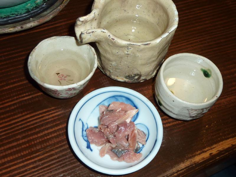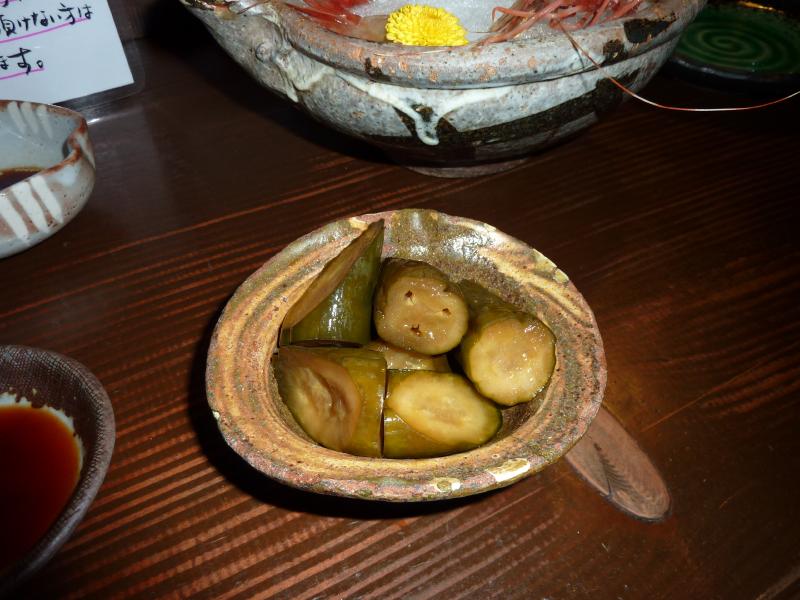 さて、まずは地魚造りの盛り合わせ。ここの造りはすべて天然とのことで、ハマチや鯛、エビなどどれ甘みと歯ごたえがあって、とてもおいしい。自家製キュウリ漬けで箸休めしながら、続いて黒鯛の塩焼き。これがカマの部分なので、かなり大きな鯛だな。焼きたてのホクホクで、プリプリした食感がいい。次はおすすめの海鮮コロッケ。これは・・・絶品。コロッケの中にはいろんな海鮮の味が詰まっていて、ソースとかをかけなくてもしっかりおいしい。これとごはんがあればいいランチにもなりそうだ。野菜もということで、新玉葱の生姜焼きを楽しみ、このあたりで日本酒へチェンジ。伊勢の地酒である伊勢錦を、サバの塩辛とともに頂く。美味しいお酒でごきげんだ。