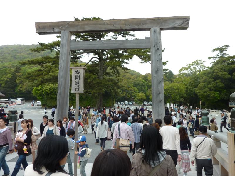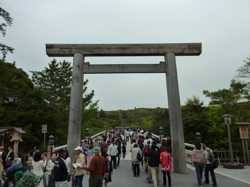 ここからはバスに乗り、10分ちょっとで内宮前まで。途中、駐車場に向かう一般の車は長蛇の列になっていた。これはいつ入れるんだろうな・・・バスでよかった。バスを降り、目の前にあるのが宇治橋。ここが伊勢神宮の表玄関だ。しかし、これはすごい人。よく写真で見るのは、誰もいない静かな橋だが、まあそれは無理としてもそれにしても人多すぎ。やっぱりゴールデンウィークですね。では渡りますか。ここ内宮は皇大神宮と呼ばれ、皇室のご祖神の天照大御神をお祀りする日本で最も尊いお宮と言われている。宇治橋鳥居をくぐり、橋を歩くと上流側に木除け杭がたっている。これは大雨は洪水に時に流木から宇治橋を守るもので、それだけ神聖な橋ということかな。橋を渡ると神苑があり、広い砂利道にはたくさんの人が歩いている。少しはずれて、松が植えられているところを歩くと人が少なくていい感じ。火除橋を渡り、到着した手水場はやっぱり人がたくさんで順番待ちだ。でもしっかりとお清めしましょう。