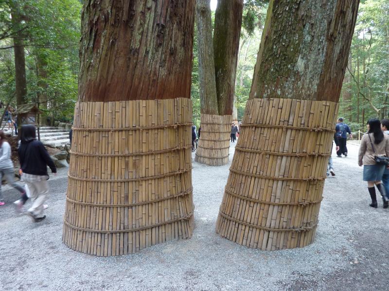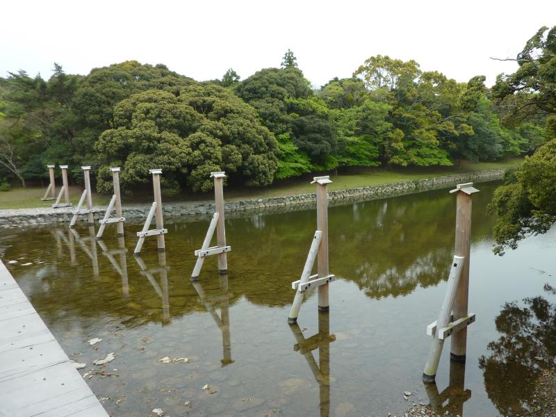 このあとは、もう一つの別宮である風日祈宮へ。新しい鳥居に新しい橋を渡ると、風日祈宮に到着。ここは風の神が祀られており、なんでも元寇の時に神風を吹かせて日本を守った神だとのこと。ここも隣に遷宮の敷地がある。橋は宇治橋よりは小ぶりだが、ちゃんと木除け杭がある。