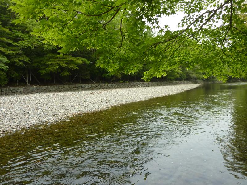 第一鳥居をくぐると、五十鈴川の御手水場がある。宇治橋の所よりは随分と細い流れだな。ここは参拝前に心身を清める場所で、冷たい水が気持ちいい。上流からのさらさらとした流れを見ていると、なんだか気持ちが落ち着いてくる。さあて、では行きますか。